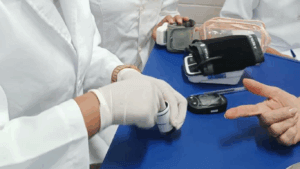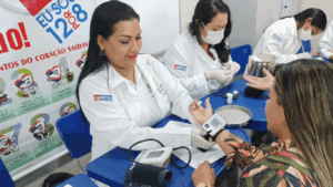 Já os acadêmicos do sétimo período de Enfermagem ficaram responsáveis por procedimentos de aferição de pressão arterial e realização de testes de glicemia capilar, contribuindo para a conscientização sobre a importância do monitoramento da saúde.