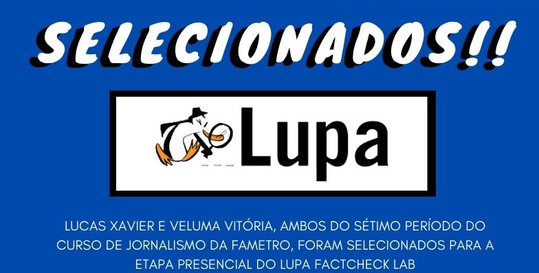 Os alunos Lucas Xavier e Veluma Vitória, ambos do sétimo período do curso de Jornalismo da FAMETRO, foram selecionados para a etapa presencial do Lupa FactCheckLab, que vai proporcionar encontros entre profissionais da Agência Lupa. Em Manaus este encontro acontece no dia 16 de abril de 2020.