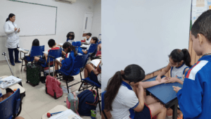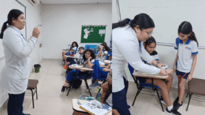 Nesta semana, os alunos do Fundamental 1 tiveram uma experiência com a técnica de enfermagem do Colégio Fametro, Sra. Miena Lucena, que compartilhou seu conhecimento e vivência na área da saúde com as crianças.