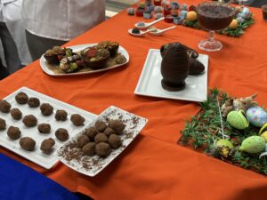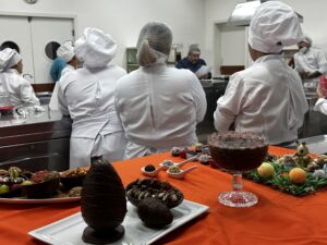 Divididos em grupos, chamados de brigadas, os alunos receberam por sorteio os desafios da aula. Cada equipe ficou responsável por preparar itens como ovos de Páscoa e suas variações, mousse de chocolate, trufas, bolos com recheio e cobertura, além de brigadeiros em diferentes pontos.