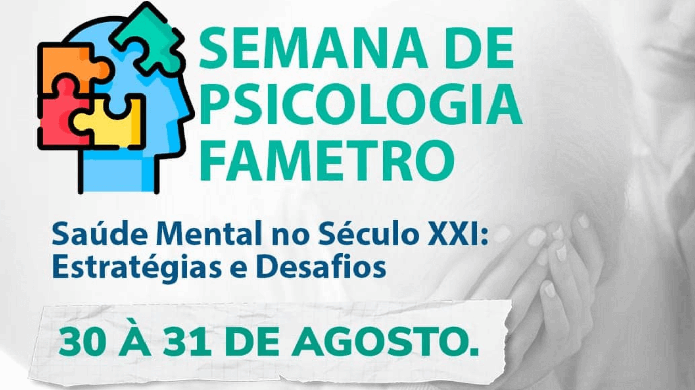 O Centro Universitário Fametro realiza, nos dias 30 e 31 de agosto, a Semana de Psicologia 2023, nas unidades 5 e 2, com o tema “Saúde Mental no Século XXI: Estratégias e Desafios” e uma programação matutina e noturna com palestras e oficinas práticas para alunos e profissionais da área. As inscrições podem ser realizadas pela internet (https://cpjur.com.br/curso/semana-de-psicologia/).