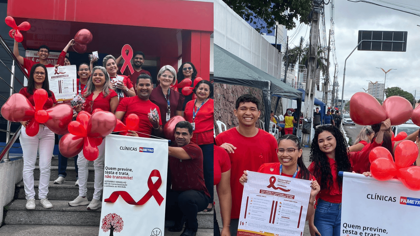Nesta terça-feira, (12), as Clínicas Fametro realizaram uma ação de conscientização e prevenção em alusão ao Dezembro Vermelho, mês de combate ao HIV/AIDS. A coordenação das clínicas organizou um Corredor Vermelho, que contou com a colaboração da equipe multidisciplinar, estagiários e o engajamento dos colaboradores.