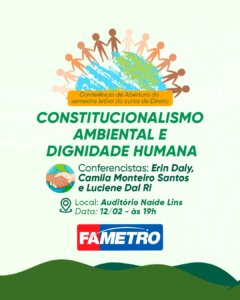 O curso de Direito do Centro Universitário Fametro realizará, no dia 12 de fevereiro, a palestra “Constitucionalismo Ambiental e Dignidade Humana: Curso de Direito da Fametro dá início ao semestre letivo com conferência de destaque internacional. O evento acontecerá no auditório Naíde Lins, a partir das 19h, reunindo especialistas nacionais e internacionais para debater a relação entre direitos indígenas, proteção ambiental e dignidade humana.
