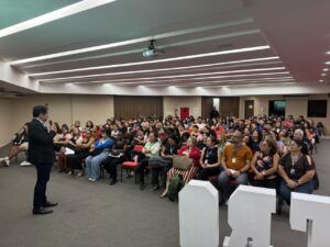 O coordenador do curso de Pedagogia, professor Elizandro Santos, realizou, na última quarta-feira (25), uma apresentação direcionada aos acadêmicos da graduação, no Auditório Naide Lins, localizado no sétimo andar da instituição. Durante o encontro, o coordenador destacou aspectos centrais da formação pedagógica, abordando a importância do compromisso ético, da atuação crítica e da responsabilidade social na construção da prática docente. A apresentação também reforçou as diretrizes acadêmicas do curso, o papel do pedagogo na sociedade e os desafios contemporâneos da educação.