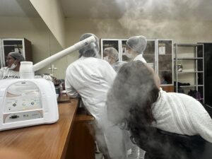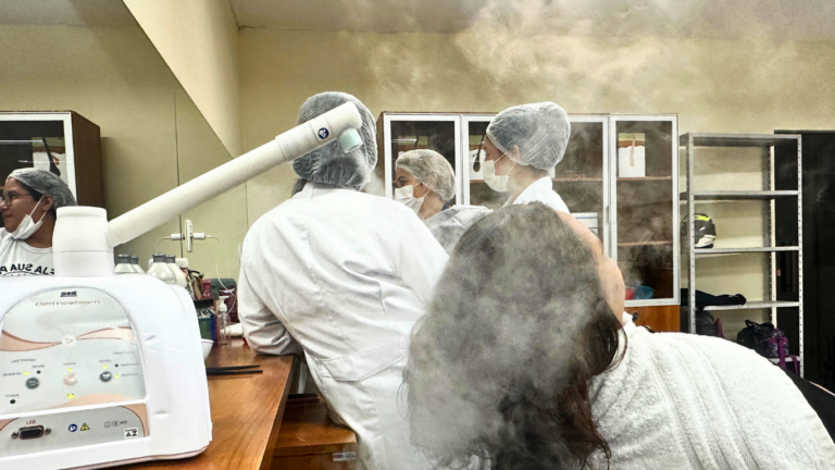 Durante a aula, os estudantes aplicaram tratamentos com argila, além de conhecerem técnicas como eletroterapia, vapor de ozônio e microagulhamento, método utilizado para estimular o crescimento capilar e auxiliar no controle da queda.