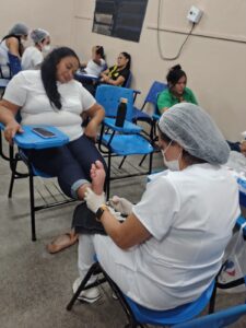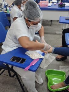 A programação de extensão também alcançou a Escola Estadual Inspetor Dulcinéia Varela Moura, onde cerca de 50 participantes receberam capacitação teórica e prática nas áreas de Designer de Sobrancelhas e Spa dos Pés. A atividade teve como objetivo desenvolver habilidades na área da estética, contribuindo para a valorização pessoal e ampliando as possibilidades de inserção no mercado de trabalho.