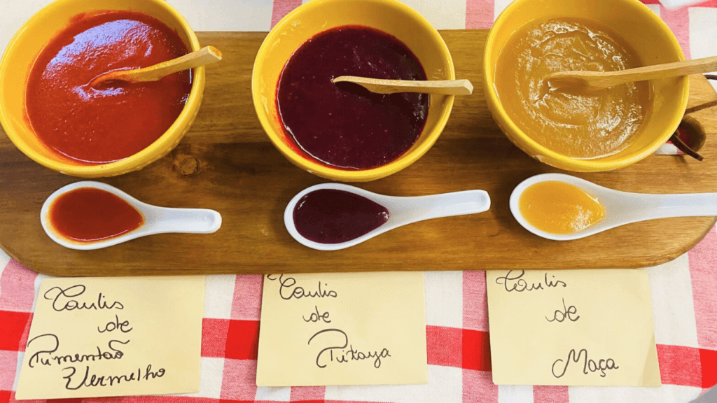 Segundo Rita de Cássia, estudante de gastronomia, “Nós trouxemos três tipos de maionese e diferentes preparos de coulis porque a maioria das pessoas pensa que coulis são apenas doces. Elas os confundem com geleias e imaginam que são sempre doces. Porém, é possível preparar coulis com qualquer ingrediente, inclusive pimentão vermelho.”