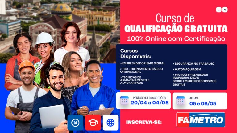Interessados em ampliar a qualificação profissional já podem se inscrever em cursos gratuitos oferecidos pelo Grupo Fametro, com foco em formação prática e rápida para o mercado de trabalho. As inscrições seguem até o dia 4 de maio, com aulas programadas para os dias 5 e 6, em diferentes áreas de atuação.