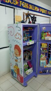 A geladeira foi produzida pelos alunos do 6º período do curso de Pedagogia, os livros e brinquedos foram conseguidos por meio de doação dos alunos, funcionários, professores, coordenadores e público externo.