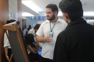 O acadêmico do 7º período Filipe Gomes apresentou, ao lado das colegas Helen Cristina dos Santos, Andrezza Cibeli Rosas de Sá e Jéssica Karen, o projeto CURAMED, uma empresa fictícia desenvolvedora de curativos inteligentes.