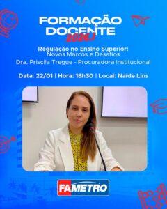 No dia 22 de janeiro, também às 18h30, no Auditório Naíde Lins, a programação inclui a palestra “Regulação no Ensino Superior: novos marcos e desafios”, ministrada pela Dra Priscila Tregue, trazendo reflexões essenciais sobre o cenário regulatório e seus impactos diretos na gestão acadêmica.