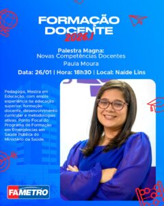 A Palestra Magna, com o tema “Novas Competências Docentes”, será realizada no dia 26 de janeiro, às 18h30, no Auditório Naíde Lins, com Paula Moura. Pedagoga e Mestra em Educação, a palestrante possui ampla experiência em educação superior, formação docente, desenvolvimento curricular e metodologias ativas, além de atuar como ponto focal do Programa de Formação em Emergências em Saúde Pública do Ministério da Saúde.