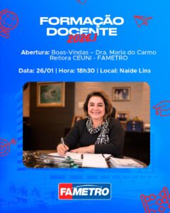 A abertura institucional ocorre no dia 26 de janeiro, às 18h30, no Auditório Naíde Lins, com a participação da reitora da Fametro, Profª Maria do Carmo Seffair, marcando oficialmente o início das atividades e reforçando a visão estratégica da instituição para o ano letivo de 2026.
