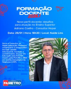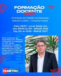 No dia 29 de janeiro, a formação contará com dois momentos estratégicos conduzidos por Adriano Coelho, sócio e consultor da Hoper Educação. Pela manhã, no Auditório Naíde Lins, serão realizadas formações em Gestão da Educação, com foco no ENADE 2026, das 8h30 às 10h, e ENADE 2027, das 10h às 11h30. À noite, às 18h30, o especialista ministra a palestra “Novo perfil docente: desafios para atuação no Ensino Superior”, aprofundando o debate sobre inovação, EaD, gestão educacional e qualidade acadêmica.