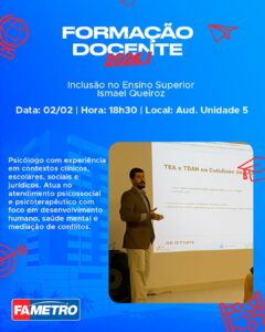 Encerrando a programação, no dia 2 de fevereiro, às 18h30, no Auditório da Unidade 5, acontece a palestra “Inclusão no Ensino Superior”, com Ismael Queiroz. Psicólogo com atuação em contextos clínicos, escolares, sociais e jurídicos, o palestrante traz uma abordagem humanizada e contemporânea sobre desenvolvimento humano, saúde mental e mediação de conflitos no ambiente acadêmico.