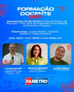 A programação segue no dia 28 de janeiro, às 18h30, no Auditório Naíde Lins, com a apresentação de resultados conduzida pela Comissão Própria de Avaliação (CPA), Setor de Qualidade e Coordenação de Extensão e Pesquisa. Participam do momento Luciano Martins, Suelânia, Aldemir e equipes dos respectivos departamentos, reforçando a cultura institucional de avaliação, transparência e melhoria contínua.