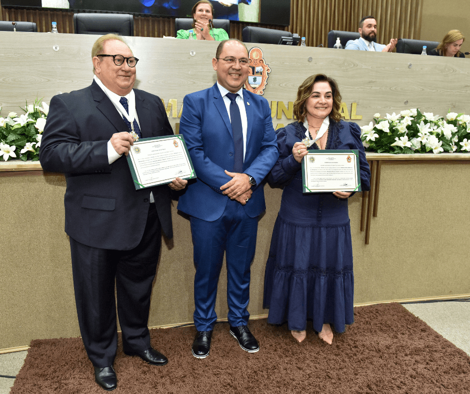 O presidente do Grupo Fametro, Wellington Lins de Albuquerque, e a Reitora do Centro Universitário Fametro e Mantenedora da Faculdade Santa Teresa, Maria do Carmo Seffair, foram homenageados nesta quarta-feira (14), em solenidade na Câmara Municipal de Manaus (CMM). Eles receberam a Medalha de Ouro Cidade de Manaus, pela atuação de destaque na área educacional, na região.