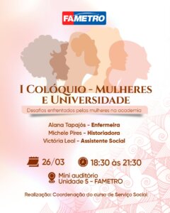 O I Colóquio – Mulheres e Universidade: Desafios enfrentados pelas mulheres na academia acontecerá no dia 26 de março de 2025, das 18h30 às 21h30, no mini auditório da Unidade 5 do Centro Universitário Fametro. O evento tem como objetivo discutir os desafios que as mulheres enfrentam no meio acadêmico e fomentar estratégias para a promoção da equidade.