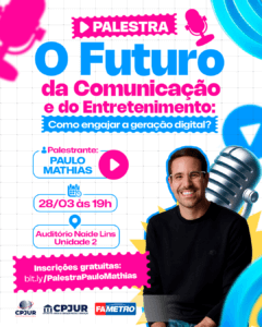 No dia 28 de março, às 19h, o auditório Naide Lins, na Unidade 2, receberá o comunicador e empresário Paulo Mathias para uma palestra sobre comunicação, jornalismo, marketing e atualidades. O evento é gratuito e conta com certificação de horas complementares para os participantes.