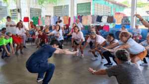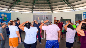 Após a palestra, os estudantes realizaram atividades práticas, como alongamentos e jogos para estimulação cognitiva, promovendo a interação e o bem-estar dos participantes.