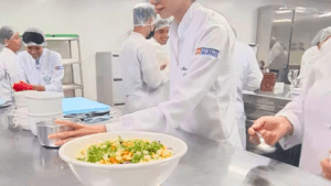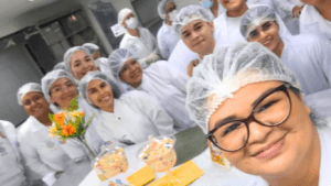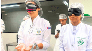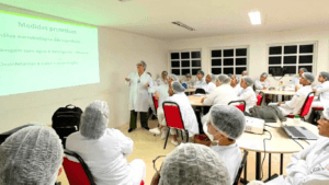 Além disso, os alunos aprenderam práticas essenciais de higienização, como a lavagem cuidadosa de vegetais, removendo partes orgânicas, e o uso de água sanitária com hipoclorito de sódio, na concentração de 2% a 2,5%, para desinfetar os alimentos. A lavagem adequada pode eliminar até 74% das sujeiras e microrganismos presentes, contribuindo para a segurança alimentar e para a saúde do consumidor.