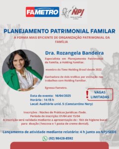 No dia 16 de abril, às 14h15, o Núcleo de Práticas Jurídicas (NPJ) do Centro Universitário Fametro realizará a palestra “Planejamento Patrimonial Familiar”, com o objetivo de apresentar estratégias eficientes para a organização e proteção do patrimônio familiar. O evento acontecerá no auditório da Unidade 5 e contará com a participação da advogada Dra. Rozangela Bandeira, egressa da instituição.