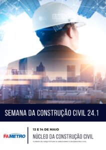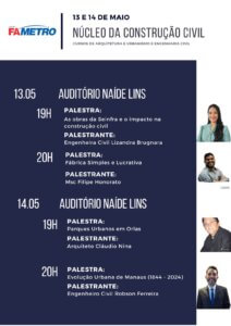 A Semana Acadêmica de Engenharia Civil 24.1 será realizada nos dias 13 e 14 de maio no Auditório Naíde Lins, no Centro Universitário Fametro, localizado na Avenida Constantino Nery, bairro Chapada. Com o tema “Dinâmica Urbana e os Desafios da Construção Civil,” o evento é organizado pelos cursos de Engenharia Civil e Arquitetura e Urbanismo.