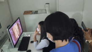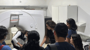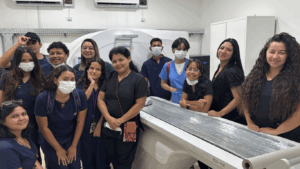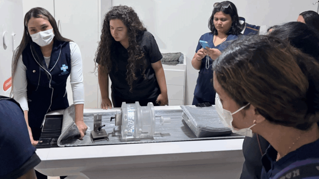 Durante a prática, os estudantes tiveram contato direto com os aparelhos de tomografia, explorando aspectos fundamentais como protocolos técnicos, parâmetros de aquisição e, principalmente, a importância da calibração correta para garantir a qualidade diagnóstica e a segurança dos pacientes.