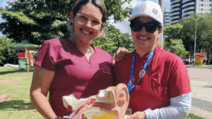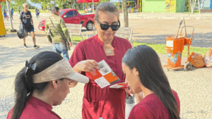 Durante a atividade, os estudantes explicaram ao público a importância dos cuidados com a audição e alertaram para os sinais de disfagia, um distúrbio que afeta a capacidade de engolir. “Se você tosse frequentemente durante ou após comer, se engasga ou sente que o alimento fica preso na garganta, esses podem ser sinais de disfagia”, orientou a Coordenadora do Curso Aline Assi.