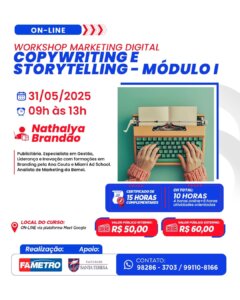 O curso livre Fametro confirma para este sábado (31) o Workshop Marketing Digital: Copywriting e Storytelling – Módulo I, voltado para acadêmicos e profissionais das áreas de comunicação e marketing, além de empreendedores e gestores interessados em aprimorar habilidades de escrita persuasiva.